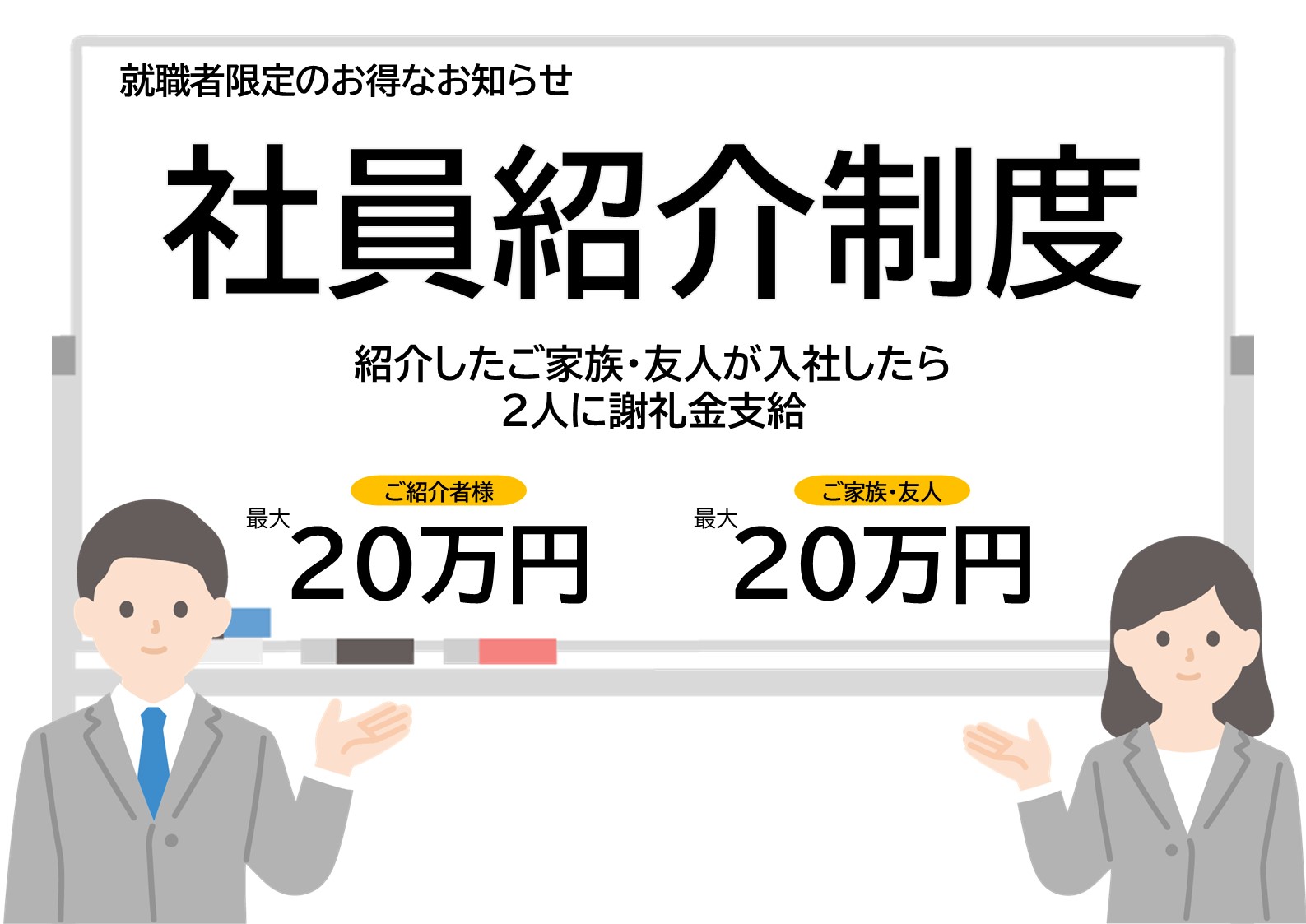 紹介したご家族・友人などの方が当社に入社した場合、謝礼金を支給(10~20万円)